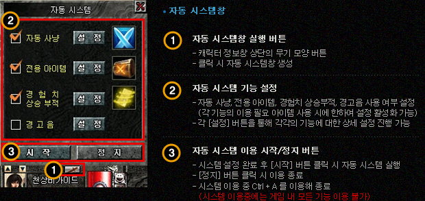 | - À¯·á ÀÚµ¿ ½Ã½ºÅÛ ÀÌ¿ë ½Ã Èû+100, ¼÷·Ãµµ+100, ü·Â+10000, ³»°ø+5000ÀÌ Áõ°¡ÇÕ´Ï´Ù. |